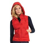 Trendy down feminine bodywarmer. Feminine fitted design. Full zip opening. Padded hood with feather touch, removable with a zip. 2 side pockets. Open hem and inner draw cord hem with 2 stoppers. Lining and accessories in matching colours. Easy access for printing and embroidery thanks to the invisible zip opening in the middle of the back. Large back area without stitching for easy decoration.